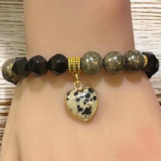 Bracelet - Pyrite and Faceted Black Onyx with Dalmatian Jasper Heart Charm