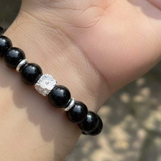 Bracelet - Black Onyx and Sterling Silver Flower Charm